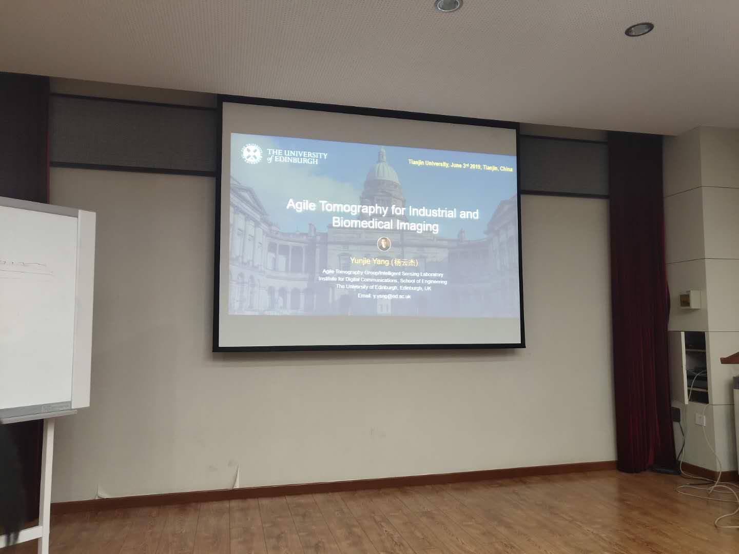 2019年6月3日,英国爱丁堡大学数据驱动中心研究员杨云杰老师应邀对课题组进行访问,并同课题组师生进行座谈及学术交流。双方就共同关心的过程层析成像技术发展及其在医学/工业上的应用等问题进行了深入的讨论。座谈期间,杨云杰老师进行了题为“Bio-medical EIT/ Agile Tomography for Medical and Industrial Imaging (生物电阻抗成像及快速层析成像技术在医学及工业可视化检测中的应用)”的学术报告,详细介绍了英国爱丁堡大学在电容层析成像、生物多频电阻抗成像系统、航空发动机激光成像等领域的研究进展与突破。